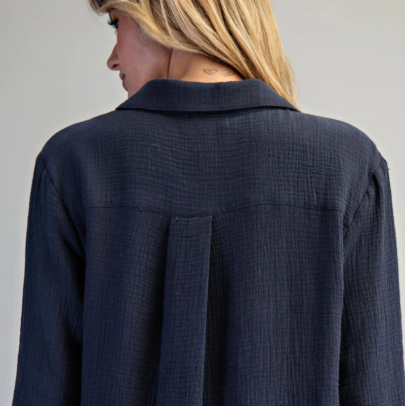 Cotton Gauze Long Sleeve Midi Dress. Solid long sleeve midi dress featuring a button-down front, a V-neckline with an attached collar, buttoned cuffs, one front chest pocket, two side slits, and side pockets.