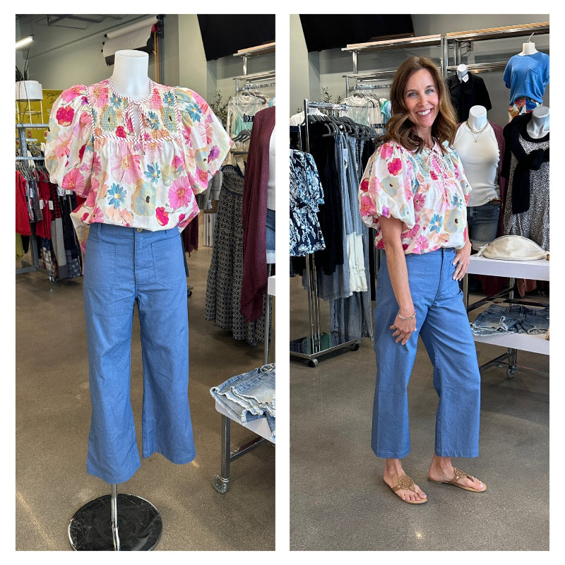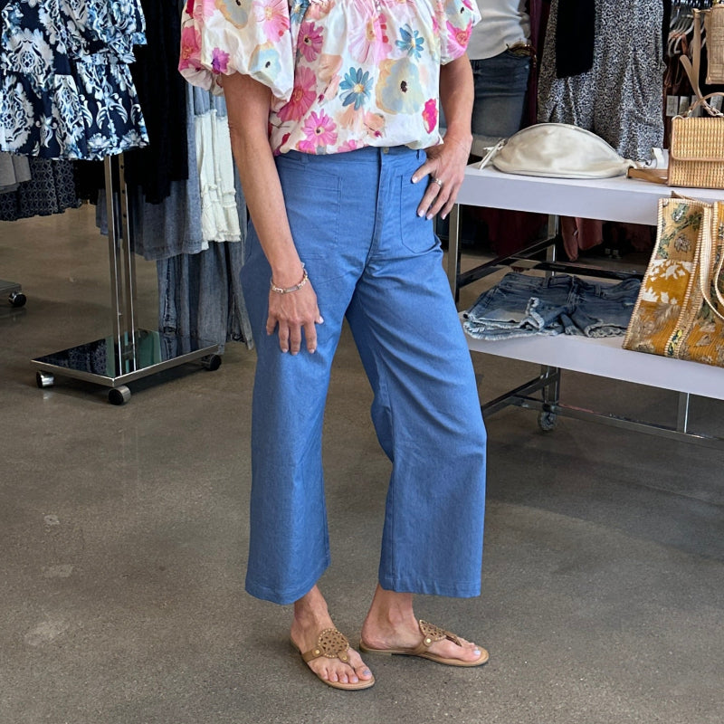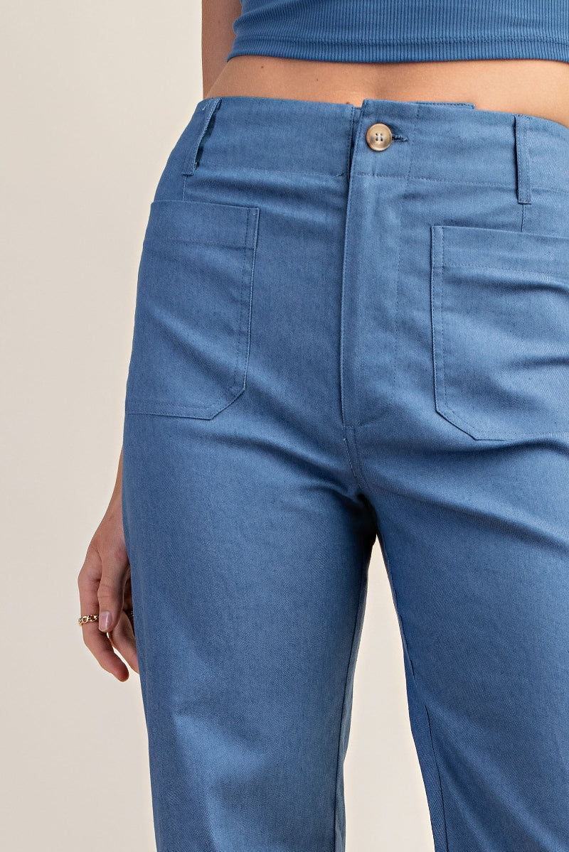 Ankle cropped pants in a stretchy denim-like fabric with front and back pockets. High waist, zip and button closure, belt loops.