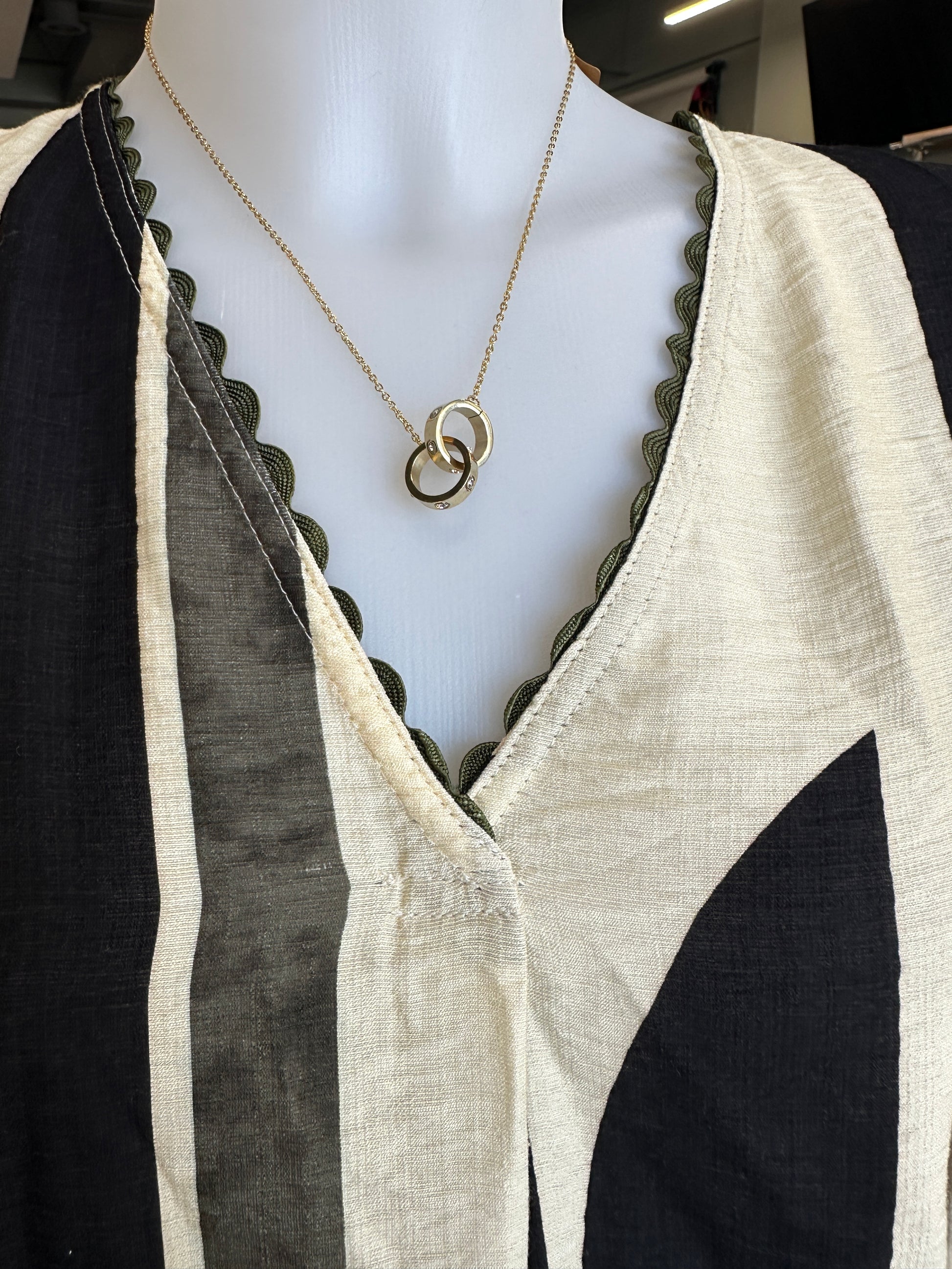 Olive abstract print top. V-neck, 3/4 sleeves with ric-rac trim, ruffle frayed bottom hem, slightly cropped.